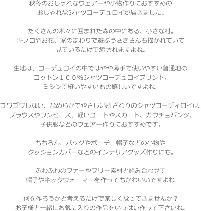 楽天市場 Forest Village フォレストヴィレッジ コットン100 シャツコーデュロイプリント素材 コットン100 生地幅 約108cm秋冬 森 家 草花 女の子 男の子 キッズ 大人 綿 ウェアー 小物 インテリア 手づくり ハンドメイド 手芸と生地の店 いすず